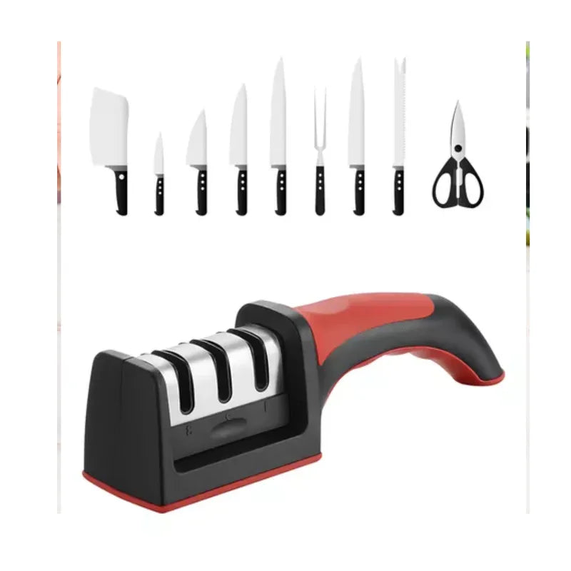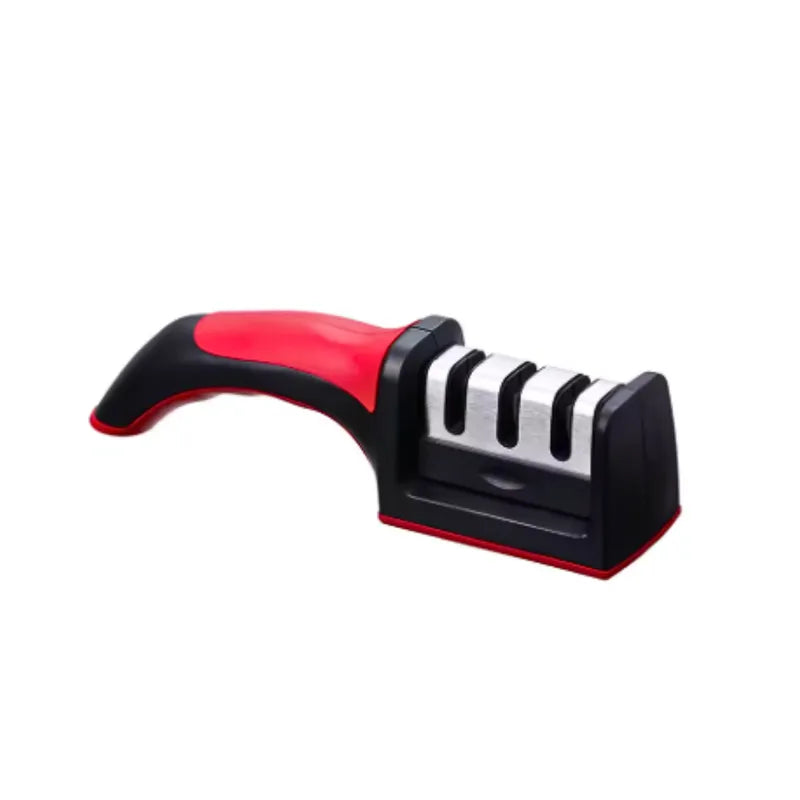 Afilador de cuchillos de piedra con Base antideslizanteNombre del producto: piedra de afilar multifuncional de 3 gradosMaterial: acero inoxidableTamaño del artículo: 22x5x6 cmColor: rojo/negroCantidad de productos básicos: 1 piezaCaracterísticas del Artículo 1: Seguridad de mano, a diferencia de los sacapuntas tradicionales, los Sacapuntas de mano son más seguros y cómodos de usar.Característica del Artículo 2: diseño antideslizante en la parte inferior, se puede colocar en el escritorio. El diseño especial antideslizante en la parte inferior hace que el afilado sea más seguro.Característica del Artículo 3: afilador rápido, diferentes posiciones corresponden a diferentes métodos, solo unos pocos tirones, su cuchillo estará muy afilado.